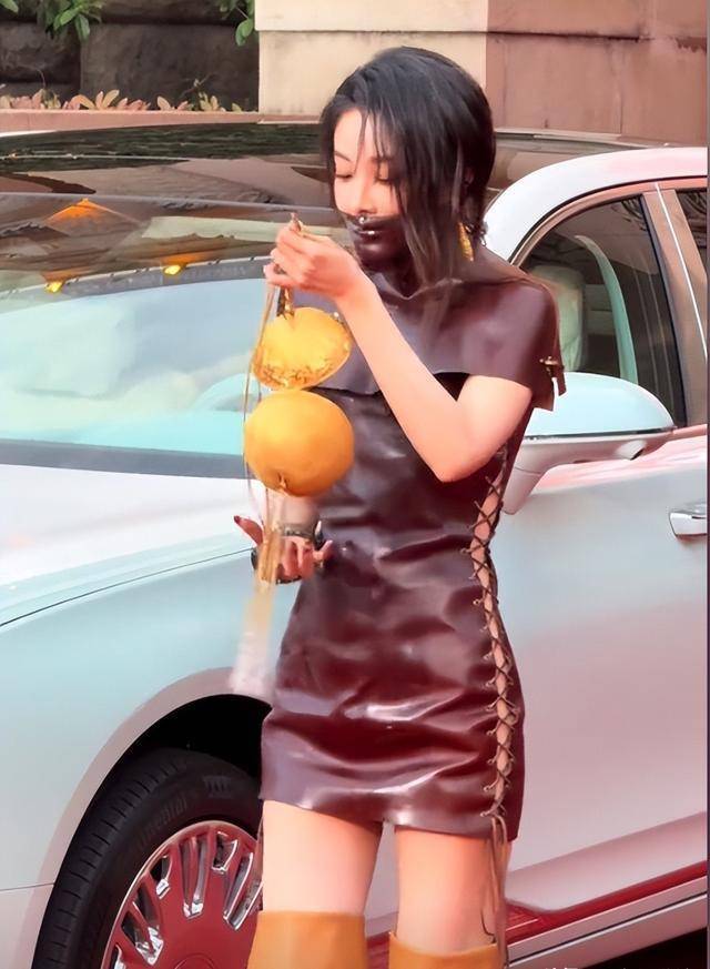 她穿着一身紫色皮革、下搭果冻鞋子,还把嘴巴给包了起来,只能说很酷、但也热!