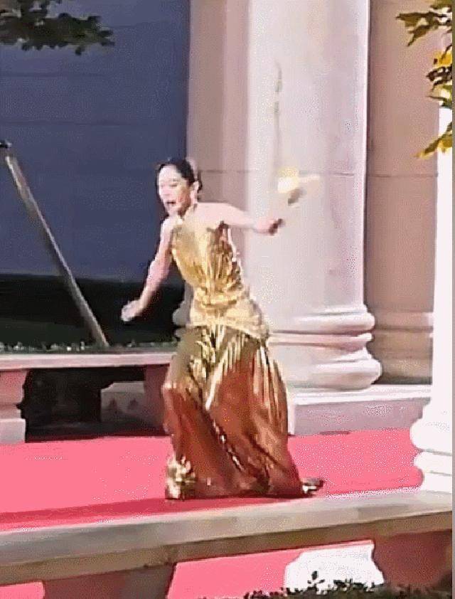不过,从网友发出的视频中,不仅能看到她手中拿着金球包,用酷似僵尸的步伐走上了红毯,挺灾难的。
